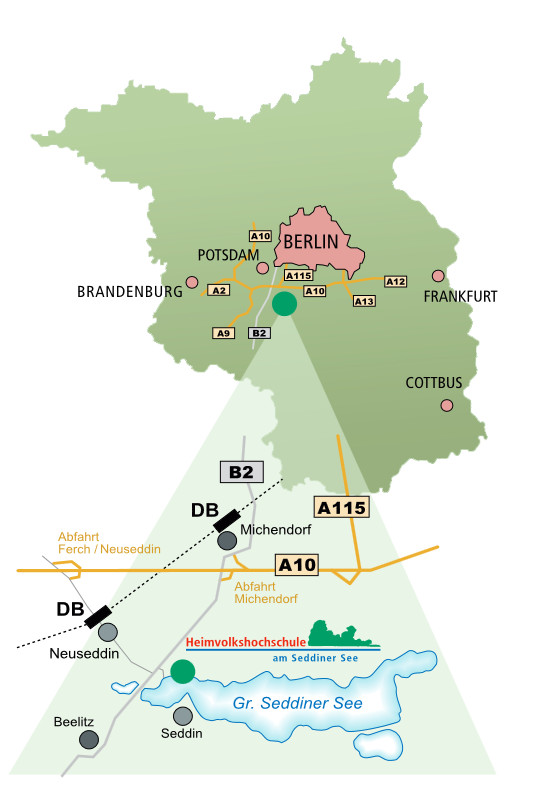 A10 (Berliner Ring); Abfahrt Michendorf /Beelitz, Richtung Beelitz (B2), nach 2,5 km links vor der 2. Ampelkreuzung abbiegen (beschilderte Zufahrt zur Heimvolkshochschule am Seddiner See, Waldweg)